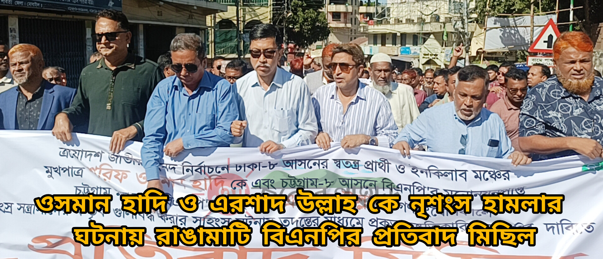 ত্রয়োদশ জাতীয় সংসদ নির্বাচনে ঢাকা-৮ আসনের স্বতন্ত্র প্রার্থী ও ইনকিলাব মঞ্চের মুখপাত্র শরিফ ওসমান হাদি কে এবং চট্টগ্রাম-৮ আসনে বিএনপি’র মনোনয়নপ্রাপ্ত চট্টগ্রাম মহানগর বিএনপি’র আহ্বায়ক এরশাদ উল্লাহ কে গণসংযোগকালে হিংস্র সন্ত্রাসীদের হামলার ঘটনায় দুষ্কৃতিকারিদের শাস্তির দাবিতে রাঙামাটি জেলা বিএনপির প্রতিবাদ মিছিল অনুষ্ঠিত হয়েছে।