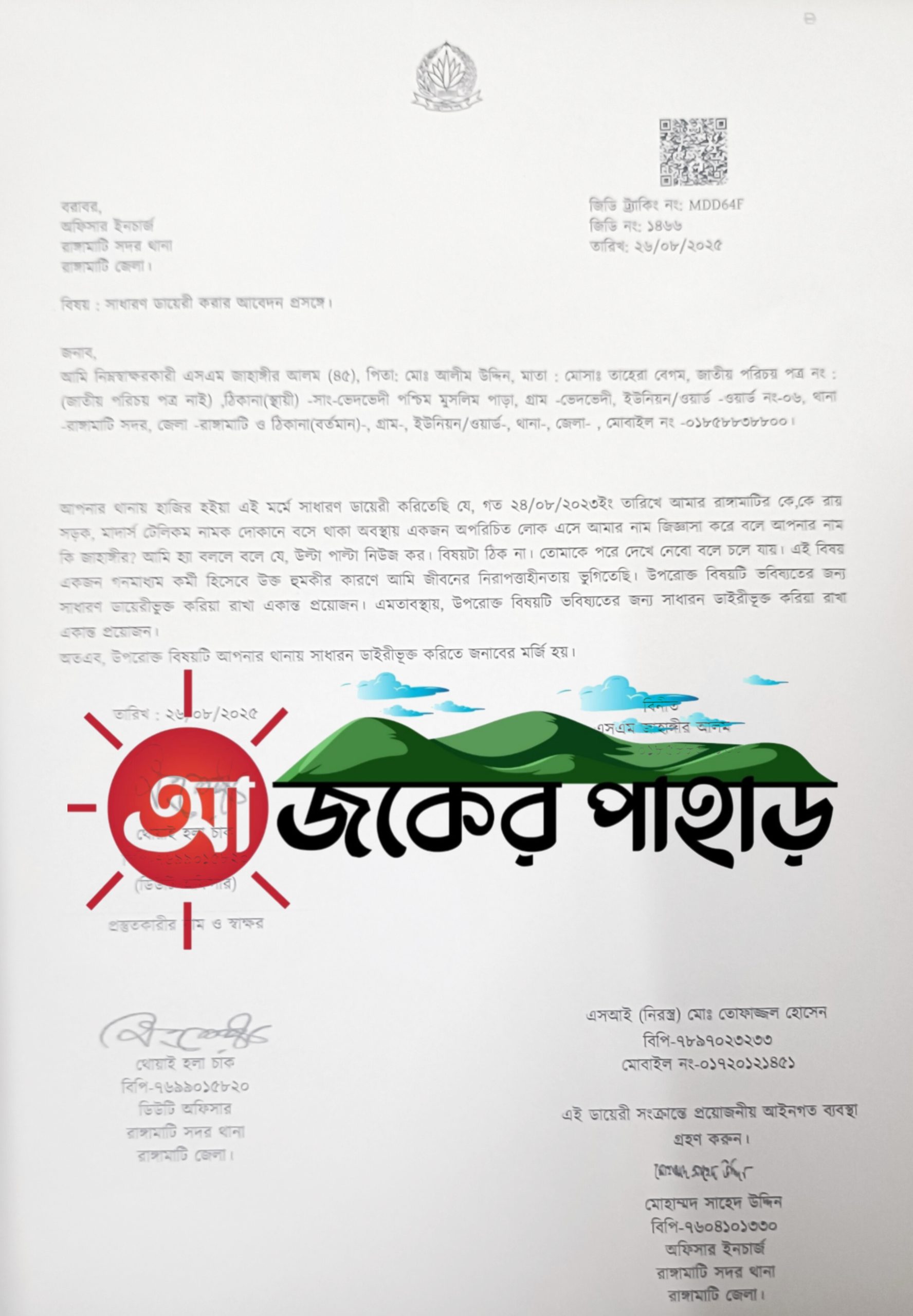 মঙ্গলবার সন্ধ্যায় রাঙামাটি কোতোয়ালি থানায় হাজির হয়ে এই সাধারণ ডায়েরি (জিডি নং- ১৪৬৬) করেন, রুপান্তর বাংলা পত্রিকার রাঙামাটি জেলা প্রতিনিধি এসএম জাহাঙ্গীর আলম।