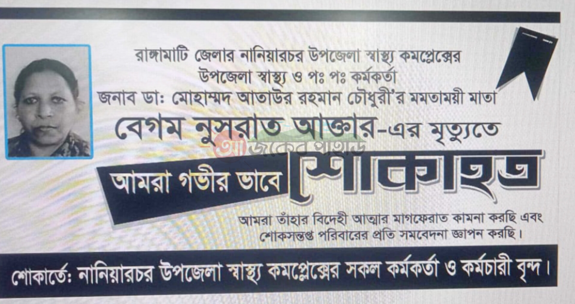 রাঙামাটির নানিয়ারচর উপজেলা স্বাস্থ্য কর্মকর্তার মায়ের মৃত্যুতে শোক জানিয়েছে নানিয়ারচর উপজেলা স্বাস্থ্য কমপ্লেক্স পরিবার।