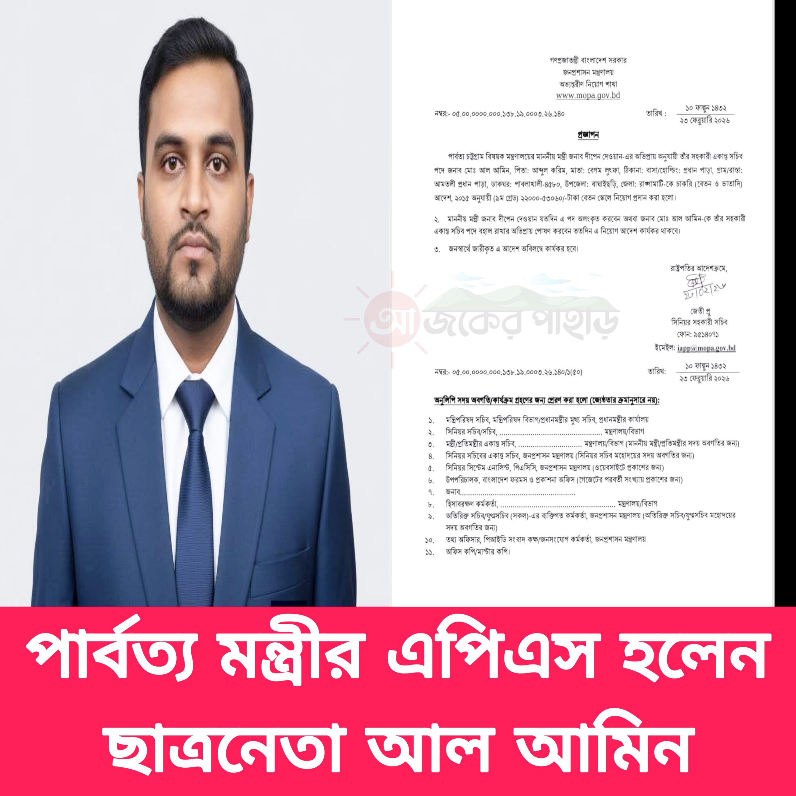 এদিকে আল আমিন পার্বত্য মন্ত্রী দীপেন দেওয়ানের সহকারী একান্ত সচিব হিসেবে নিয়োগ পাওয়ায় এলাকা জুড়ে ছড়িয়ে পড়েছে খুশির আমেজ। দুর্গম পাহাড়ি এলাকা থেকে উঠে এসে গুরুত্বপূর্ণ দাপ্তরিক দায়িত্ব পাওয়ায় এলাকায় সন্তোষ প্রকাশ করেছেন স্থানীয় নেতাকর্মী ও সাধারণ মানুষ। নতুন দায়িত্ব পালনের মাধ্যমে আল আমিন পার্বত্য অঞ্চলের উন্নয়ন ও প্রশাসনিক কার্যক্রমে কার্যকর ভূমিকা রাখবেন বলে আশা করছেন স্থানীয়রা।