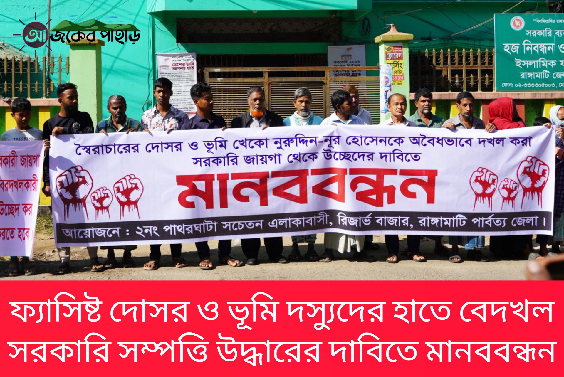 সরকারি জায়গা অবৈধভাবে দখলে নিয়ে স্থাপনা নির্মাণের পায়তারা ও এলাকার সচেতন মানুষকে নানাভাবে হুমকি ধামকি প্রদানের প্রতিবাদে মনববন্ধন করেছে রাঙামাটি শহরের রিজার্ভ বাজার ও ২নং পাথরঘাটার অধিবাসীরা। মানববন্ধন থেকে দখলকারীদের ফ্যাসিষ্ট আওয়ামী লীগের দোসর ও ভূমি দস্যু হিসেবে আখ্যায়িত করে অবিলম্বে তাদের সরকারি জায়গা থেকে উচ্ছেদ করে জাতীয় সম্পত্তি রক্ষায় কার্যকর উদ্যোগ নেওয়ার জন্য স্থানীয় প্রশাসন এবং সড়ক বিভাগের প্রতি জোর দাবি জানিয়েছেন এলাকাবাসী।