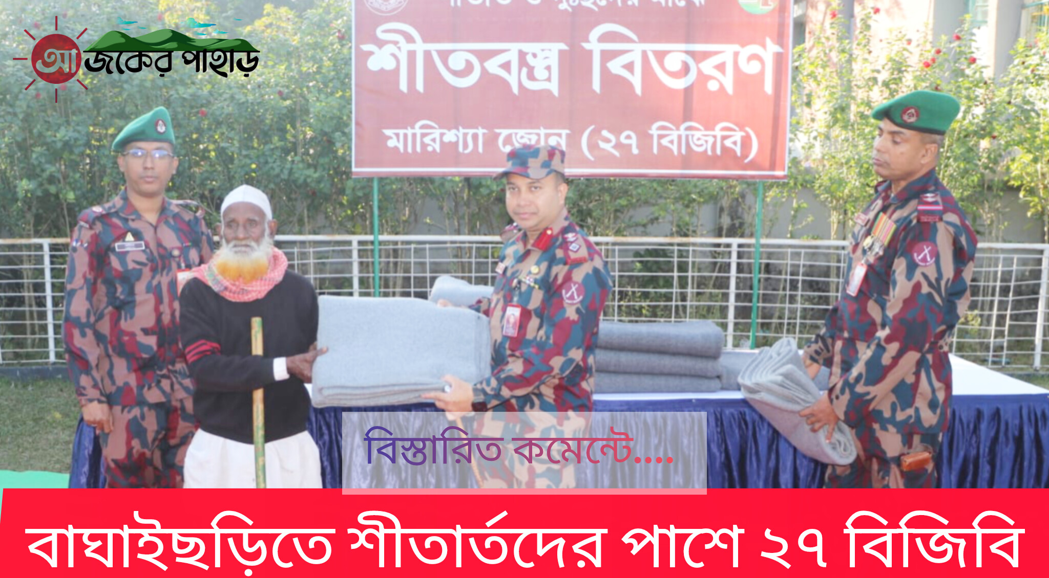 রাঙামাটির বাঘাইছড়িতে শান্তি, সম্প্রীতি ও উন্নয়নের অব্যাহত ধারায় পাহাড়ি ও বাঙালি জনগোষ্ঠীর মাঝে শীতবস্ত্র বিতরণ করেছে মারিশ্যা জোন (২৭ বিজিবি)।